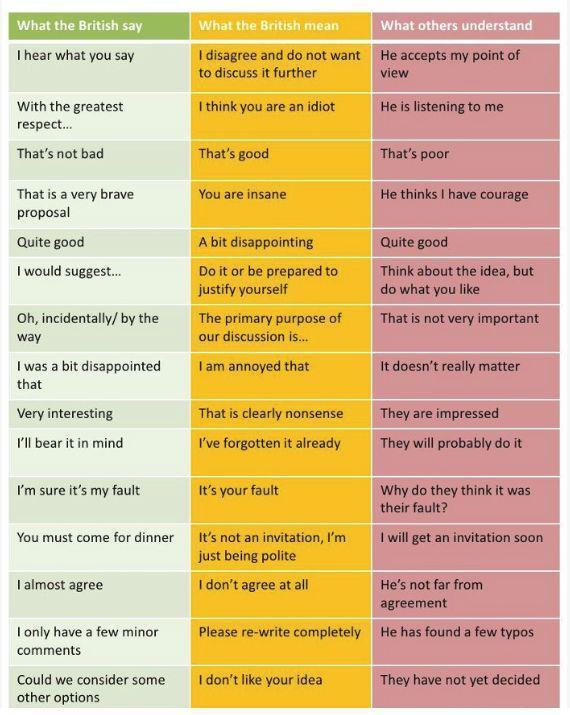 Funny What British People Say, Versus What They Mean…very funny Date: April 10, 2015Author: CarlesZ 0 Comments Not sure if it’s 100% true, cause from my 2 years of living in UK, you can distinguish if British are talking in sarcastic mode or not. A bit of exaggeration… Share this now! Click to share on X (Opens in new window) X Click to share on LinkedIn (Opens in new window) LinkedIn Click to print (Opens in new window) Print Click to email a link to a friend (Opens in new window) Email Like Loading... Related