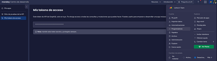 As always you need to get Access Tokens from Monday: Go to your profile, developers, Access Tokens, Generate it and keep it safe.