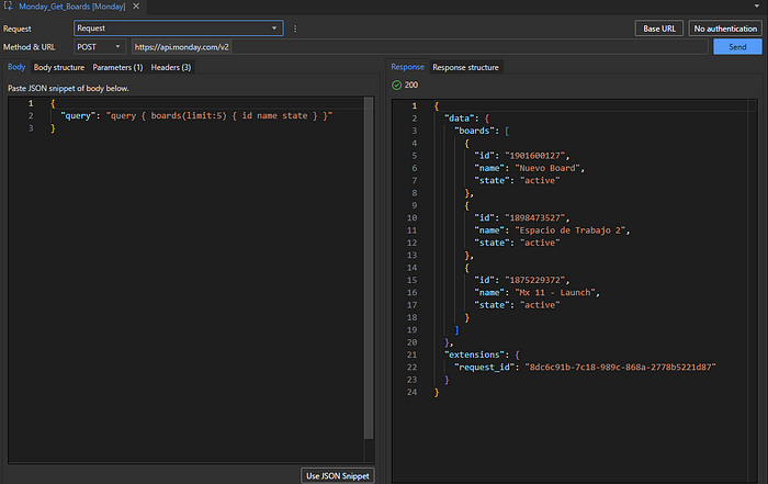 So, our first task must be to fetch the Monday.com boards (Javascript example).