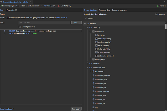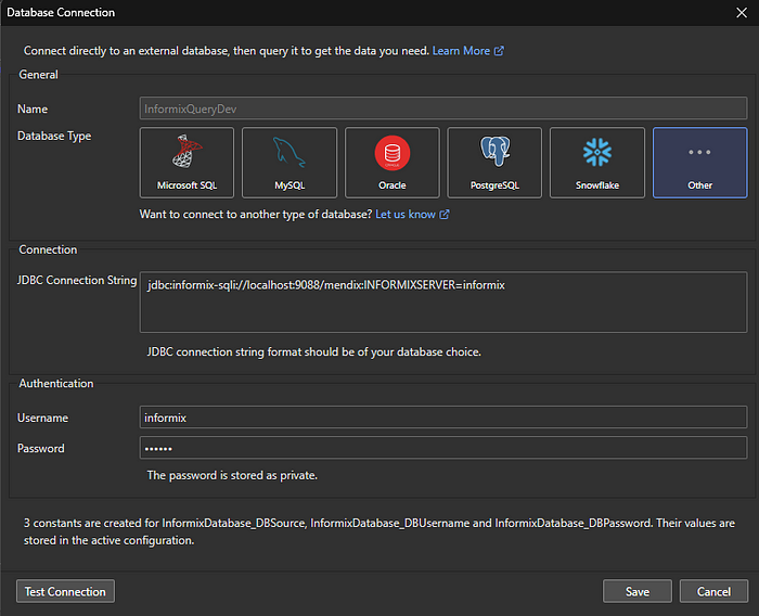- Permissions: Ensure user access (either on the Informix table owner and Mendix user RBAC rights.